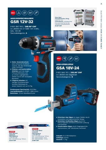 Extra Hard Schrauberbit-Set, 43%u2011tlg.2 607 017 727Farbcodiertes, umfangreiches Pick and Click-Set f%u00fcr alle Standard-Schraubarbeiten45.35* CHFAKKU-S%u00c4BELS%u00c4GEGSA 18V-240%u2005601%u20056A5%u2005101 / 225.00* CHF in L-BOXX mit S%u00e4geblattServicekategorie: B%u25fe Erleichtert das S%u00e4gen an engen Stellen durch kompaktes und ergonomisches Design%u25fe Erleichtert kraftvolles S%u00e4gen durch ihr hervorragendes Verh%u00e4ltnis zwischen Leistung und Gewicht%u25fe Komfortables S%u00e4gen durch Gegengewichtsmechanismus, der Vibrationen minimiertAKKU-BOHRSCHRAUBERGSR 12V-320%u2005601%u20059N7%u2005002 / 249.00* CHF in L-BOXX mit 2%u2009%u00d7%u2009GBA 12V 2.0Ah, GAL 12V-20 Servicekategorie: AHubzahl: 0%u20133.100 H%u00fcbe/minHubl%u00e4nge: 24%u2009mmGewicht: 1,7%u2009kgDrehmoment (hart/weich): 32/21NmLeerlaufdrehzahl: 0-475/0%u20131.800 U/minBohrfutter: 10%u2009mm Metallbohrfutter%u25fe Hoher Anwenderschutz dank Advanced KickBack Control, die das Verletzungsrisiko minimiert%u25fe Pr%u00e4zises und komfortables Arbeiten auch bei engen Platzverh%u00e4ltnissen und an schwer zug%u00e4nglichen Stellen durch sehr kompakte Bauweise%u25fe L%u00e4ngeres Arbeiten mit weniger Erm%u00fcdung dank leichtem Werkzeug mit einem Gewicht von nur 0,7%u2009kgThin Tough Metal S922EHM S%u00e4bels%u00e4geblatt2 608 900 360Max. Schnittleistung: 100%u2009mm Max. Materialst%u00e4rke: 4%u2009mm Min. Materialst%u00e4rke: 1,5%u2009mm23.80* CHFMulti Material S956XHM S%u00e4bels%u00e4geblatt2 608 900 389Max. Schnittleistung: 100%u2009mm24.10* CHFNEU!NEU!Bosch PRO NEWS Schweiz | 01.09.%u2009%u2013%u200931.12.2025 | Tertial 33