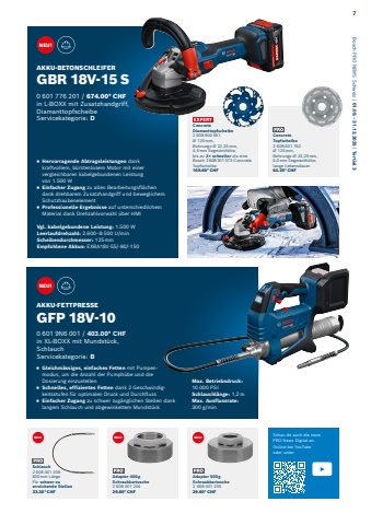 Vgl. kabelgebundene Leistung: 1.500 WLeerlaufdrehzahl: 2.600%u20138.500 U/minScheibendurchmesser: 125%u2009mmEmpfohlene Akkus: EXBA18V-55/-80/-150AKKU-FETTPRESSEGFP 18V-100%u2005601%u20059N6%u2005001 / 403.00* CHFin XL-BOXX mit Mundst%u00fcck, SchlauchServicekategorie: B %u25fe Gleichm%u00e4ssiges, einfaches Fetten mit Pumpenmodus, um die Anzahl der Pumph%u00fcbe und die Dosierung einzustellen%u25fe Schnelles, effizientes Fetten dank 2 Geschwindigkeitsstufen f%u00fcr optimalen Druck und Durchfluss%u25fe Einfacher Zugang zu schwer zug%u00e4nglichen Stellen dank langem Schlauch und abgewinkeltem Mundst%u00fcckMax. Betriebsdruck: 10.000 PSISchlauchl%u00e4nge: 1,2%u2009mMax. Ausflussrate: 300 g/minAKKU-BETONSCHLEIFERGBR 18V-15 S0%u2005601%u2005776%u2005201 / 674.00* CHF in L-BOXX mit Zusatzhandgriff, DiamanttopfscheibeServicekategorie: D%u25fe Hervorragende Abtragsleistungen dank kraftvollem, b%u00fcrstenlosem Motor mit einer vergleichbaren kabelgebundenen Leistung von 1.500 W%u25fe Einfacher Zugang zu allen Bearbeitungsfl%u00e4chen dank drehbarem Zusatzhandgriff und beweglichem Schutzhaubenelement%u25fe Professionelle Ergebnisse auf unterschiedlichem Material dank Drehzahlvorwahl %u00fcber HMIConcrete Topfscheibe2 608 601 762%u2205 125%u2009mm, Bohrungs-%u00d8 22,23%u2009mm,5,0%u2009mm Segmenth%u00f6he,lange Lebensdauer64.35* CHFConcrete Diamanttopfscheibe2 608 900 651%u00d8 125%u2009mm, Bohrungs-%u00d8 22,23%u2009mm, 4,5%u2009mm Segmenth%u00f6he,bis zu 2%u2009%u00d7 schneller als eine Bosch 2%u2009608%u2009301%u2009573 Concrete Topfscheibe169.60* CHFAdapter 400%u2009g Schraubkartusche2 608 001 20429.80* CHFAdapter 500%u2009g Schraubkartusche2 %u2009608 001 20529.80* CHFSchlauch 2 608 001 206600%u2009mm L%u00e4ngeF%u00fcr schwer zu erreichende Stellen33.30* CHFSchau dir auch die neue PRO News Digital an. Online bei YouTube oder unter: NEU!NEU!NEU! NEU! NEU!Bosch PRO NEWS Schweiz | 01.09.%u2009%u2013%u200931.12.2025 | Tertial 37