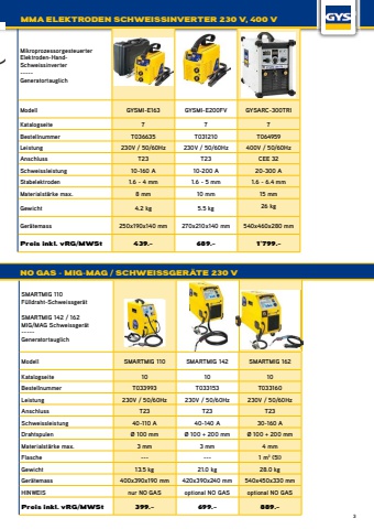 33MMA ELEKTRODEN SCHWEISSINVERTER 230 V, 400 VMikroprozessorgesteuerterElektroden-HandSchweissinverter-----GeneratortauglichModell GYSMI-E163 GYSMI-E200FV GYSARC-300TRIKatalogseite 7 7 7Bestellnummer T036635 T031210 T064959Leistung 230V / 50/60Hz 230V / 50/60Hz 400V / 50/60HzAnschluss T23 T23 CEE 32Schweissleistung 10-160 A 10-200 A 20-300 AStabelektroden 1.6 - 4 mm 1.6 - 5 mm 1.6 - 6.4 mmMaterialst%u00e4rke max. 8 mm 10 mm 15 mmGewicht 4.2 kg 5.5 kg 26 kg Ger%u00e4temass 250x190x140 mm 270x210x140 mm 540x460x280 mmPreis inkl. vRG/MWSt 439.%u2013 689.%u2013 1%u2018799.%u2013NO GAS - MIG-MAG / SCHWEISSGER%u00c4TE 230 VSMARTMIG 110F%u00fclldraht-Schweissger%u00e4tSMARTMIG 142 / 162MIG/MAG Schweissger%u00e4t-----GeneratortauglichModell SMARTMIG 110 SMARTMIG 142 SMARTMIG 162Katalogseite 10 10 10Bestellnummer T033993 T033153 T033160Leistung 230V / 50/60Hz 230V / 50/60Hz 230V / 50/60HzAnschluss T23 T23 T23Schweissleistung 40-110 A 40-140 A 30-160 ADrahtspulen %u00d8 100 mm %u00d8 100 + 200 mm %u00d8 100 + 200 mmMaterialst%u00e4rke max. 3 mm 3 mm 4 mmFlasche --- --- 1 m3 (5l)Gewicht 13.5 kg 21.0 kg 28.0 kgGer%u00e4temass 400x390x190 mm 420x390x240 mm 540x450x330 mmHINWEIS nur NO GAS optional NO GAS optional NO GASPreis inkl. vRG/MWSt 399.%u2013 699.%u2013 889.%u2013