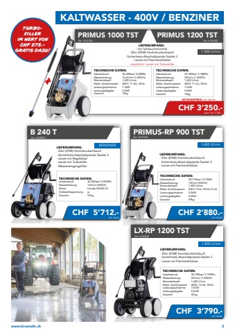 www.kraenzle.ch 3AKTIONSPREIS inkl. MwSt.TECHNISCHE DATEN:Arbeitsdruck 30-180bar/ 3-18MPaWasserleistung 20l/min (1.200l/h)Motordrehzahl 1.400 U/minElektr. Anschlusswert 400V, 11.4A, 50HzLeistungsaufnahme 7.5kWLeistungsabgabe 5.5kWGewicht 75kgTECHNISCHE DATEN:Arbeitsdruck 30-220bar/ 3-22MPaWasserleistung 16,6l/min (1.000l/h)Motordrehzahl 1.400 U/minElektr. Anschlusswert 400V, 11.4A, 50HzLeistungsaufnahme 7.5kWLeistungsabgabe 5.5kWGewicht 75kgCHF 3%u2018250.-TURBOKILLER IM WERT VON CHF 273.- GRATIS DAZU!+LIEFERUMFANG:%u00b7 mit Schlauchtrommel%u00b7 20m (DN8) Hochdruckschlauch%u00b7 Sicherheits-Abschaltpistole Starlet 3%u00b7 Lanze mit Flachstrahld%u00fcse%u00b7 zus%u00e4tzlich: Lanze mit Turbokiller1.400 U/minstatt CHF 3%u2018380.- PRIMUS 1000 TST PRIMUS 1200 TSTArt. 614150 Art. 614160CHF 2%u2018880.- PRIMUS-RP 900 TSTLIEFERUMFANG:%u00b7 20m (DN8) Hochdruckschlauch%u00b7 Sicherheits-Abschaltpistole Starlet 3%u00b7 Lanze mit Flachstrahld%u00fcseArt. 6141401.400 U/minTECHNISCHE DATEN:Arbeitsdruck 30-170bar/ 3-17MPaWasserleistung 15l/min (900l/h)Motordrehzahl 1.400 U/minElektr. Anschlusswert 400V, 9.4A, 50Hz (16 A)Leistungsaufnahme 5.5kWLeistungsabgabe 4.0kWGewicht 59kgCHF 3%u2018790.- LX-RP 1200 TSTLIEFERUMFANG:%u00b7 20m (DN8) Hochdruckschlauch%u00b7 Sicherheits-Abschaltpistole Starlet 3%u00b7 Lanze mit Flachstrahld%u00fcseTECHNISCHE DATEN:Arbeitsdruck 30-190bar/ 3-19MPaWasserleistung 20l/min (1.200l/h)Motordrehzahl 1.400 U/minElektr. Anschlusswert 400V, 14.3A, 50HzLeistungsaufnahme 7,5kWLeistungsabgabe 5,5kWGewicht 94kgArt. 6160601.400 U/minCHF 5%u2018712.- B 240 Tinkl. MwStLIEFERUMFANG:%u00b7 20m (DN8) Hochdruckschlauch%u00b7 Sicherheits-Abschaltpistole Starlet 3%u00b7 Lanze mit Regeld%u00fcse%u00b7 Lanze mit Turbokiller%u00b7 WassereingangsfilterTECHNISCHE DATEN:Arbeitsdruck 30-220bar/ 3-22MPaWasserleistung 16l/min (960l/h)Motor Honda GX340 LXDrehzahlregulierung jaGewicht 92kgArt. 620023BENZINERKALTWASSER - 400V / BENZINERinkl. MwStinkl. MwSt