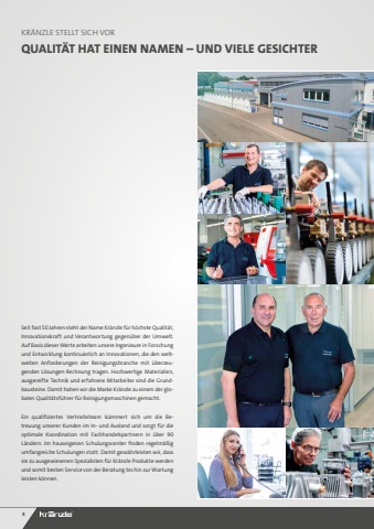 4QUALIT%u00c4T HAT EINEN NAMEN %u2013 UND VIELE GESICHTERKR%u00c4NZLE STELLT SICH VORSeit fast 50 Jahren steht der Name Kr%u00e4nzle f%u00fcr h%u00f6chste Qualit%u00e4t, Innovationskraft und Verantwortung gegen%u00fcber der Umwelt. Auf Basis dieser Werte arbeiten unsere Ingenieure in Forschung und Entwicklung kontinuierlich an Innovationen, die den weltweiten Anforderungen der Reinigungsbranche mit %u00fcberzeugenden L%u00f6sungen Rechnung tragen. Hochwertige Materialien, ausgereifte Technik und erfahrene Mitarbeiter sind die Grundbausteine. Damit haben wir die Marke Kr%u00e4nzle zu einem der globalen Qualit%u00e4tsf%u00fchrer f%u00fcr Reinigungsmaschinen gemacht.Ein qualifiziertes Vertriebsteam k%u00fcmmert sich um die Betreuung unserer Kunden im In- und Ausland und sorgt f%u00fcr die optimale Koordination mit Fachhandelspartnern in %u00fcber 90 L%u00e4ndern. Im hauseigenen Schulungscenter finden regelm%u00e4%u00dfig umfangreiche Schulungen statt. Damit gew%u00e4hrleisten wir, dass sie zu ausgewiesenen Spezialisten f%u00fcr Kr%u00e4nzle Produkte werden und somit besten Service von der Beratung bis hin zur Wartung leisten k%u00f6nnen.