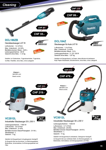CHF 479.- CHF 619.-CHF 219.- CHF 319.-CHF 99.-CHF 139.-CHF 55.- CHF 85.-CleaningKlasse L : H%u00e4lt 99% vom Staub zur%u00fcck.Klasse L : H%u00e4lt 99% vom Staub zur%u00fcck.DCL184ZStaubsauger f%u00fcr Auto LXT %u00aeLuftvolumen : 1,4 m%u00b3/minMax. Unterdruck : 5,4 kPaBeh%u00e4ltervolumen Staub : 0,5 LLeistungsaufnahme : 5 / 23 / 38 WGewicht ohne Akku : 1,67 kgGeliefert mit Saugschlauch, 3x D%u00fcsen, kleine B%u00fcrste mit drehbarem Kopf, Papier-Staubs%u00e4cke, Schulterriemen, ohne Akku, ohne Ladeger%u00e4tVC3012LIndustrieller Staubsauger 30 L 230 VLeistungsaufnahme : 1%u2019200 WLuftvolumen : 3,7 m%u00b3/minMax. Unterdruck : 25 kPaBeh%u00e4ltervolumen Staub/Fl%u00fcssigkeit : 24/19 LStaubklasse : L Gewicht : 11 kgGeliefert mit Saugschlauch antistatisch, Gebogener Handgriff, 2x Saugrohr-Set aus rostfreiem Stahl, 3x Werkzeugadapter, 3x Bodend%u00fcse, Schmald%u00fcse, 5x Entsorgungss%u00e4cke und FilterVC2512L Industrieller Staubsauger 25 L 230 VLeistungsaufnahme : 1%u2019000 WLuftvolumen : 3,6 m%u00b3/minMax. Unterdruck : 21 kPaBeh%u00e4ltervolumen Staub/Fl%u00fcssigkeit : 21/18 LStaubklasse : L Gewicht : 7 kgGeliefert mit Saugschlauch mit gebogenem Handgriff, 2x Saugrohr-Set aus Aluminium, 3x Werkzeugadapter, Bodend%u00fcse, Universald%u00fcse, 5x Entsorgungss%u00e4cke und FilterDCL180ZBHandstaubsauger LXT %u00aeLuftvolumen : 1,4 m%u00b3/minMax. Unterdruck : 4,2 kPaBeh%u00e4ltervolumen Staub : 0,65 LLeistungsaufnahme : 30 WGewicht ohne Akku : 1,12 kgGeliefert mit Bodend%u00fcse, Fugend%u00fcsenhalter, Fugend%u00fcse, Vorfilter, Fliesfilter, ohne Akku, ohne Ladeger%u00e4t11