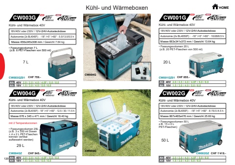 120CW003G CW001GCW002GCW002GZCW003GZ01 CW001GZ017 L 20 L50 LCW004GCW004GZ29 LCW004GCW002GAh Ah 40V 2.0 / 2.5 / 4.0 / 4.0F / 5.0 / 8.0 Ah Ah 18V 1.5 / 3.0 / 4.0 / 5.0 / 6.0 Ah Ah 40V 2.0 / 2.5 / 4.0 / 4.0F / 5.0 / 8.0 Ah Ah 18V 1.5 / 3.0 / 4.0 / 5.0 / 6.0 Ah Ah 40V 2.0 / 2.5 / 4.0 / 4.0F / 5.0 / 8.0 Ah Ah 18V 1.5 / 3.0 / 4.0 / 5.0 / 6.0 Ah Ah 40V 2.0 / 2.5 / 4.0 / 4.0F / 5.0 / 8.0 Ah Ah 18V 1.5 / 3.0 / 4.0 / 5.0 / 6.0 K%u00fchl- und W%u00e4rmeboxen HOME18V/40V oder 230V / 12V-/24V-AutosteckdoseAutonomie (2x BL4040F) : -18%u00b0 /+5%u00b0 /+60%u00b0 : 5.5/13.5/5.5 hMasse 456x245x308 mm / Gewicht 7.64 kgK%u00fchl- und W%u00e4rmebox 40V18V/40V oder 230V / 12V-/24V-AutosteckdoseAutonomie (2x BL4050F) : -18%u00b0 /+5%u00b0 /+60%u00b0 : 10/28/8.5 hMasse 663x341x372 mm / Gewicht 13.64 kgK%u00fchl- und W%u00e4rmebox 40V18V/40V oder 230V / 12V-/24V-Autosteckdose Autonomie (2x BL4050F) : -18%u00b0 /+5%u00b0 /+60%u00b0 : 8 /19.5 /4.5 hMasse 867x465x476 mm / Gewicht 25.60 kgK%u00fchl- und W%u00e4rmebox 40V%u2022 Fassungsvolumen 7 L  (z.B. 6 PET-Flaschen von 500 ml)%u2022 Fassungsvolumen 20 L  (z.B. 20 PET-Flaschen von 500 ml)%u2022 Fassungsvolumen 50 L z.B. 15 x 2 L PET-Flaschen)18V/40V oder 230V / 12V-/24V-AutosteckdoseAutonomie (2x BL4050F) : 18%u00b0 /+5%u00b0 /+60%u00b0 : 12.5 / 30 / 11.5 hMasse 676 x 345 x 471 mm / Gewicht 18.40 kgK%u00fchl- und W%u00e4rmebox 40Vmit 2 Temperaturzonen%u2022 Fassungsvolumen 29L (z.B. 3 x 350 ml Dosen + 4 x 2 L PET-Flaschen k%u00f6nnen vertikal aufbewahrt werden)CHF 759.- CHF 855.-CHF 945.- CHF 1%u2019419.-