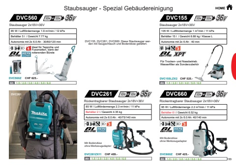 133DVC560DVC560ZAh Ah 1.5 / 2.0 / 3.0 / 4.0 / 5.0 / 6.0 DVC660DVC660ZDVC261DVC261ZX11DVC261Ah Ah 1.5 / 2.0 / 3.0 / 4.0 / 5.0 / 6.0 Ah Ah 1.5 / 2.0 / 3.0 / 4.0 / 5.0 / 6.0 DVC155DVC155LZX2Ah Ah 1.5 / 2.0 / 3.0 / 4.0 / 5.0 / 6.0 HOME85 W / Luftf%u00f6rdermenge 1.9 m3/min / 12 kPaBeh%u00e4lter 5 l / Gewicht 7.77 kgAutonomie mit 2x 6.0 Ah : 30/60/120 min Staubsauger 2x18V=36VIdeal f%u00fcr Teppiche und Fussmatten, dank der rotierenden B%u00fcrsteStaubsauger - Spezial Geb%u00e4udereinigungMit Bodend%u00fcse ohne WerkzeugadapterR%u00fcckentragbarer Staubsauger 2x18V=36V95 W / Luftf%u00f6rdermenge 2.2 m3/min / 11 kPa Beh%u00e4lter 6 l / Gewicht 6.52 kg Autonomie mit 2x 6.0 Ah: 40/140 minMit Bodend%u00fcse ohne Werkzeugadapter85 W / Luftf%u00f6rdermenge 2.3 m3/min / 11 kPa Beh%u00e4lter 2 l / Gewicht 4.35 kgAutonomie mit 2x 6.0 Ah : 40/75/140 min R%u00fcckentragbarer Staubsauger 2x18V=36VDVC155, DVC261, DVC660: Diese Staubsauger werden mit Saugschlauch und Bodend%u00fcse geliefert.F%u00fcr Trocken- und Nassbetrieb. Wasserfilter als Sonderzubeh%u00f6rStaubsauger 2x18V=36V105 W / Luftf%u00f6rdermenge 1 m3/min / 11 kPa Beh%u00e4lter 15 l / Gewicht 8.88 kg / Klasse LAutonomie mit 2x 6 Ah : 40 min CHF 625.-CHF 409.- CHF 425.-CHF 525.-