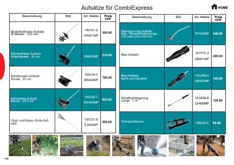 146HOMEBeschreibung Bild Art. Makita PreisCHFWasserpumpe Aufsatz Max. Wasserf%u00f6rdermenge : 135 l/min (mit UX01G)PF400MP 349.00Blas-Aufsatz 191P72-3UB401MP289.00Blas-Aufsatz leicht und handlich1912R8-4UB402MP149.00Schaftverl%u00e4ngerungL%u00e4nge : 1 m 191E24-8LE400MP139.00Transporttasche 195638-5 89.00Beschreibung Bild Art. Makita PreisCHFBodenkultivator-Aufsatz%u00d8 Messer : 232 mm 199181-6KR401MP355.00Schneefr%u00e4ser Aufsatz Arbeitsbreite : 30 cm SN400MP 315.00Kehrb%u00fcrsten-AufsatzB%u00fcrste : 25 cm 199318-5BR400MP789.00Kehrwalze-Aufsatz B%u00fcrste : 26.5 cm199339-7SW400MP823.00Obst- und Nuss- Ernte-Auf- satz 195721-8EJ400MP299.00Aufs%u00e4tze f%u00fcr CombiExpress