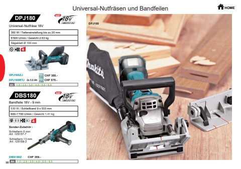 98DPJ180DPJ180ZJDPJ180RTJ 2x 5.0 AhDBS180DBS180ZAh Ah 1.5 / 2.0 / 3.0 / 4.0 / 5.0 / 6.0Ah Ah 1.5 / 2.0 / 3.0 / 4.0 / 5.0 / 6.0DPJ180HOME350 W / Tiefeneinstellung bis zu 20 mm6%u2019500 U/min / Gewicht 2.63 kgS%u00e4geblatt %u00d8 100 mmUniversal-Nutfr%u00e4se 18VBandfeile 18V - 9 mm530 W / Schleifband 9 x 533 mm600-1%u2019700 U/min / Gewicht 1.41 kgUniversal-Nutfr%u00e4sen und BandfeilenSonder-Zubeh%u00f6r :Schleifarm 6 mmArt. 125157-7Schleifarm 13 mmArt. 125159-3CHF 355.-CHF 575.-CHF 359.-