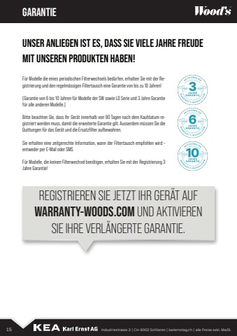 UNSER ANLIEGEN IST ES, DASS SIE VIELE JAHRE FREUDE MIT UNSEREN PRODUKTEN HABEN!F%u00fcr Modelle die eines periodischen Filterwechsels bed%u00fcrfen, erhalten Sie mit der Registrierung und den regelm%u00e4ssigen Filtertausch eine Garantie von bis zu 10 Jahren!(Garantie von 6 bis 10 Jahren f%u00fcr Modelle der SW sowie LD Serie und 3 Jahre Garantie f%u00fcr alle anderen Modelle.)Bitte beachten Sie, dass Ihr Ger%u00e4t innerhalb von 90 Tagen nach dem Kaufdatum registriert werden muss, damit die erweiterte Garantie gilt. Ausserdem m%u00fcssen Sie die Quittungen f%u00fcr das Ger%u00e4t und die Ersatzfilter aufbewahren.Sie erhalten eine zeitgerechte Information, wann der Filtertausch empfohlen wird %u2013 entweder per E-Mail oder SMS.F%u00fcr Modelle, die keinen Filterwechsel ben%u00f6tigen, erhalten Sie mit der Registrierung 3 Jahre Garantie!GARANTIEREGISTRIEREN SIE JETZT IHR GER%u00c4T AUFWARRANTY-WOODS.COM UND AKTIVIERENSIE IHRE VERL%u00c4NGERTE GARANTIE.15 Industriestrasse 3 | CH-8952 Schlieren | karlernstag.ch | alle Preise exkl. MwSt.