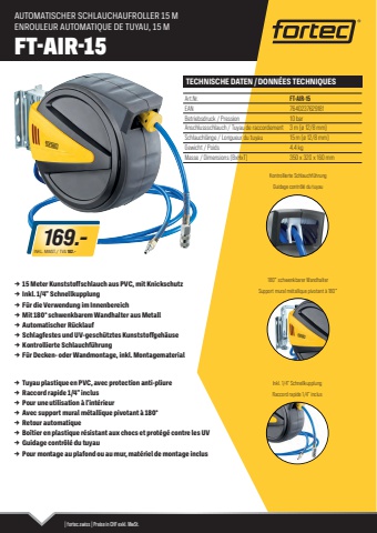 | fortec.swiss | Preise in CHF exkl. MwSt.Kontrollierte Schlauchf%u00fchrungGuidage contr%u00f4l%u00e9 du tuyau180%u00b0 schwenkbarer WandhalterSupport mural m%u00e9tallique pivotant %u00e0 180%u00b0TECHNISCHE DATEN / DONN%u00c9ES TECHNIQUESArt.Nr. FT-AIR-15EAN 7640237629181Betriebsdruck / Pression 10 barAnschlussschlauch / Tuyau de raccordement 3 m (%u00f8 12/8 mm)Schlauchl%u00e4nge / Longueur du tuyau 15 m (%u00f8 12/8 mm)Gewicht / Poids 4.4 kgMasse / Dimensions (BxHxT) 350 x 320 x 160 mm15 Meter Kunststoffschlauch aus PVC, mit KnickschutzInkl. 1/4\F%u00fcr die Verwendung im InnenbereichMit 180%u00b0 schwenkbarem Wandhalter aus MetallAutomatischer R%u00fccklaufSchlagfestes und UV-gesch%u00fctztes Kunststoffgeh%u00e4useKontrollierte Schlauchf%u00fchrungF%u00fcr Decken- oder Wandmontage, inkl. Montagematerial%u2192%u2192%u2192%u2192%u2192%u2192%u2192%u2192INKL. MWST./ TVA 182.-169.-AUTOMATISCHER SCHLAUCHAUFROLLER 15 MENROULEUR AUTOMATIQUE DE TUYAU, 15 MFT-AIR-15Tuyau plastique en PVC, avec protection anti-pliureRaccord rapide 1/4\Pour une utilisation %u00e0 l'int%u00e9rieurAvec support mural m%u00e9tallique pivotant %u00e0 180%u00b0Retour automatiqueBo%u00eetier en plastique r%u00e9sistant aux chocs et prot%u00e9g%u00e9 contre les UVGuidage contr%u00f4l%u00e9 du tuyauPour montage au plafond ou au mur, mat%u00e9riel de montage inclus%u2192%u2192%u2192%u2192%u2192%u2192%u2192%u2192Inkl. 1/4\Raccord rapide 1/4\