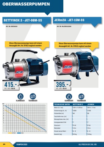24 PUMPEN 2023 ALLE PREISE IN CHF, EXKL. VRGTECHNISCHE DATEN BETTYINOX 3 JCRM2AMotor (V / kw) 230 V / 0.55 kw 230 V / 1.1 kwF%u00f6rdermenge (lt. /h) 3'600 4'200 F%u00f6rderh%u00f6he (m) 48 60 Tauchtiefe max. (m) - -Absaugniveau max. (m) - -Innengewinde G Zoll 1\1\Schutzart IP 44 IP 44Netzkabel 1.5 m 1.5 mEinsatz bei pH-Wert 6 %u2013 8 6 %u2013 8Gewicht (kg) 8.0 kg 11.8 kgArt. Nr. 46JCR2A15A1HBETTYINOX 3 - JET-08M-SS JCRm2A - JET-15M-SS415.-INKL. MWST 446.96Art. Nr. KBX56A1H Klarwasser Teichwasser Klarwasser Teichwasser395.-INKL. MWST 425.42Diese Oberwasserpumpe kann mit einemAnsaugkit Art. Nr. 97012 erg%u00e4nzt werdenDiese Oberwasserpumpe kann mit einemAnsaugkit Art. Nr. 97012 erg%u00e4nzt werdenOBERWASSERPUMPEN