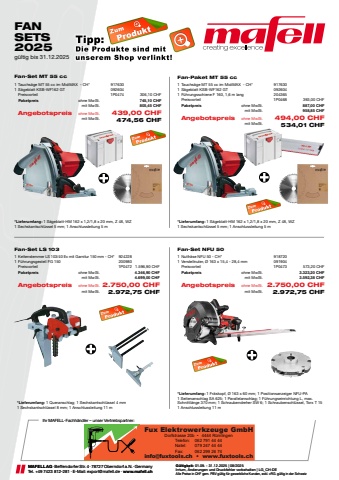 Fan-Set MT 55 ccFan-Set LS 103Fan-Set NFU 50Ihr MAFELL-Fachh%u00e4ndler %u2013 unser Vertriebspartner:G%u00fcltigkeit: 01.09. - 31.12.2025 | 08/2025Irrtum, %u00c4nderungen und Druckfehler vorbehalten| LG_CH-DE Alle Preise in CHF gem. PBV g%u00fcltig f%u00fcr gewerbliche Kunden, exkl. vRG. g%u00fcltig in der SchweizMAFELL AG %u00b7 Beffendorfer Str. 4 %u00b7 78727 Oberndorf a.N. %u00b7 GermanyTel. +49 7423 812-281 %u00b7 E-Mail: export@mafell.de %u00b7 www.mafell.chFAN SETS2025g%u00fcltig bis 31.12.2025Fan-Paket MT 55 cc1Tauchs%u00e4ge MT 55 cc im MidiMAX - CH*9176301S%u00e4geblatt KSB-WF162 GT092604Preisvorteil 1P0474306,10 CHFPaketpreisohne MwSt. 745,10 CHF mit MwSt. 805,45 CHFAngebotspreisohne MwSt. 439,00 CHFmit MwSt. 474,56 CHF*Lieferumfang: 1 S%u00e4geblatt-HM 162 x 1,2/1,8 x 20 mm, Z 48, WZ1 Sechskantschl%u00fcssel 5 mm; 1 Anschlussleitung 5 m1Tauchs%u00e4ge MT 55 cc im MidiMAX - CH*9176301S%u00e4geblatt KSB-WF162 GT0926041F%u00fchrungsschiene F 160, 1,6 m lang204365Preisvorteil 1P0468393,00 CHFPaketpreisohne MwSt. 887,00 CHF mit MwSt. 958,85 CHFAngebotspreisohne MwSt. 494,00 CHFmit MwSt. 534,01 CHF*Lieferumfang: 1 S%u00e4geblatt-HM 162 x 1,2/1,8 x 20 mm, Z 48, WZ1 Sechskantschl%u00fcssel 5 mm; 1 Anschlussleitung 5 m1Kettenstemmer LS 103/40 Ec mit Garnitur 150 mm - CH*9242281F%u00fchrungsgestell FG 150200980Preisvorteil 1P04721.596,90 CHFPaketpreisohne MwSt. 4.346,90 CHF mit MwSt. 4.699,00 CHFAngebotspreisohne MwSt. 2.750,00 CHFmit MwSt. 2.972,75 CHF*Lieferumfang: 1 Queranschlag; 1 Sechskantschl%u00fcssel 4 mm1 Sechskantschl%u00fcssel 8 mm; 1 Anschlussleitung 11 m1Nutfr%u00e4se NFU 50 - CH*9187201Verstellnuter, %u00d8 163 x 15,4 - 28,4 mm091904Preisvorteil 1P0473573,20 CHFPaketpreisohne MwSt. 3.323,20 CHF mit MwSt. 3.592,38 CHFAngebotspreisohne MwSt. 2.750,00 CHFmit MwSt. 2.972,75 CHF*Lieferumfang: 1 Fr%u00e4skopf, %u00d8 163 x 60 mm; 1 Positionsanzeiger NFU-PA 1 Seitenanschlag SA 625; 1 Parallelanschlag; 1 F%u00fchrungseinrichtung L, max. Schnittl%u00e4nge 370 mm; 1 Schraubendreher SW 6; 1 Schraubenschl%u00fcssel, Torx T 151 Anschlussleitung 11 mIhr MAFELL-Fachh%u00e4ndler %u2013 unser Vertriebspartner:G%u00fcltigkeit: 01.09. - 31.12.2025 | 08/2025Irrtum, %u00c4nderungen und Druckfehler vorbehalten| LG_CH-DE Alle Preise in CHF gem. PBV g%u00fcltig f%u00fcr gewerbliche Kunden, exkl. vRG. g%u00fcltig in der SchweizMAFELL AG %u00b7 Beffendorfer Str. 4 %u00b7 78727 Oberndorf a.N. %u00b7 GermanyTel. +49 7423 812-281 %u00b7 E-Mail: export@mafell.de %u00b7 www.mafell.chFux Elektrowerkzeuge GmbHinfo@fuxtools.ch %u2022 www.fuxtools.chDorfstrasse 20b %u20224444 R%u00fcmlingen062 791 44 44079 247 44 44062 299 26 74Telefon:Natel:Fax:
