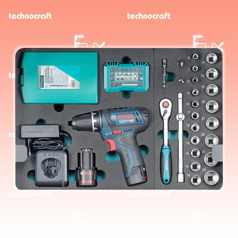 Einzigartiger Koffer welcher Handwerkzeuge von technocraft und Akkuschrauber GSR12V-15 von BOSCH in einem Koffer vereint. Sie sparen viel Platz und schweres Schleppen von verschiednen Koffer da beides in einem Koffer vereint ist.