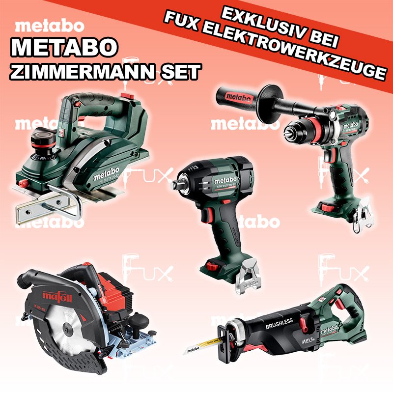 Heute auf dieses Produkt 20% Rabatt! Zu "Zimmermann Set" von Metabo FULL Service: 36 Monate zum Nulltarif für Sie! Weitere Infos zum FULL Service Dieses Produkt ist CAS kompatibel! Weitere Infos zu CAS FUX SPECIAL EXKLUSIV BEI FUX Metabo Zimmermann SET 7 SOLO Bestell- und Artikelnummer: Zimmermann SET 7 SOLO BS 18 LTX BL Q I Akku-BohrschrauberAkkuspannung 18 V Drehzahl 0-550 / 0-2000 U/min Drehmoment hart / weich 130 / 65 Nm Gewicht (mit Akkupack) 2.3 kgInfos SSW 18 LTX 550 BL Akku-SchlagschrauberAkkuspannung 18 V Anziehdrehmoment 550 Nm Werkzeugaufnahme 1/2" Gewicht ohne Akkupack 1,4 kgInfos SSEP 18 LTX BL MVT Akku-SäbelsägeAkkuspannung 18 V Hubzahl bei Leerlauf 0 - 3.000 /min Gewicht (mit Akkupack) 4.6 kgInfos HO 18 LTX 20-82 Akku-Einhand-HobelAkkuspannung 18 V Hobelbreite 82 mm Spanabnahme einstellbar 0-2 mm Gewicht 3.5 KgInfos K 85 - 18 PURE Akku-Handkreissägen im L-MAXSchnitttiefe 0 – 88 mm Schnitttiefe bei 45° 0 – 61.5 mm Gewicht (mit Akku) 8.1 kgInfos OHNE AKKUS UND LADEGERÄT Standard-Ausrüstung In diesem Set enthalten: BS 18 LTX BL Q I Akku-Bohrschrauber SSW 18 LTX 550 BL Akku-Schlagschrauber SSEP 18 LTX BL MVT Akku-Säbelsäge HO 18 LTX 20-82 Akku-Einhand-Hobel K 85 - 18 PURE Akku-Handkreissägen im L-MAX Listenpreis CHF 2'582.20 Fuxpreis CHF 2'066.00 inkl. 8.1% MwSt, inkl vRG Versand CHF 25.00 Kein Grauimport! Produkt bestellen 1 Stück 2 Stück 3 Stück 4 Stück 5 Stück 6 Stück 7 Stück 8 Stück 9 Stück 10 Stück Alle Angaben ohne Gewähr und solange Vorrat reicht!Wiederverkäufer werden? Produkt als PDF NEUHEITAKTION 20%