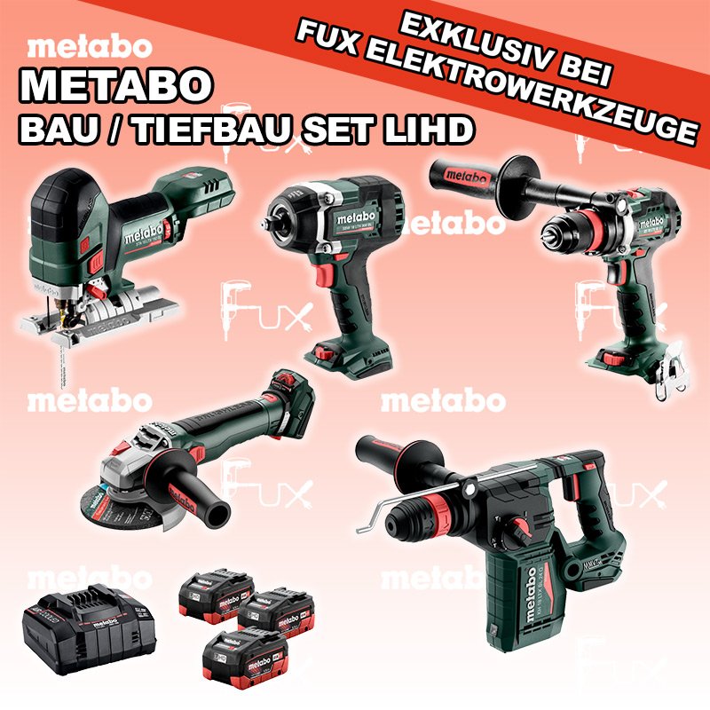 Metabo Bau / Tiefbau Set 4 LiHD BS 18 LTX BL Q I Akku-Bohrschrauber STA 18 LTX 150 BL Akku-Stichsäge Akku-Kombihammer KH 18 LTX BL 28 Q WB 18 LTX BL 15-125 Quick Akku-Winkelschleifer SSW 18 LTX 800 BL Akku-Schlagschrauber 18 V,  5.5 Ah, LiHD Akkupack ASC 145, 12 - 36 V "Air Cooled" Ladegerät