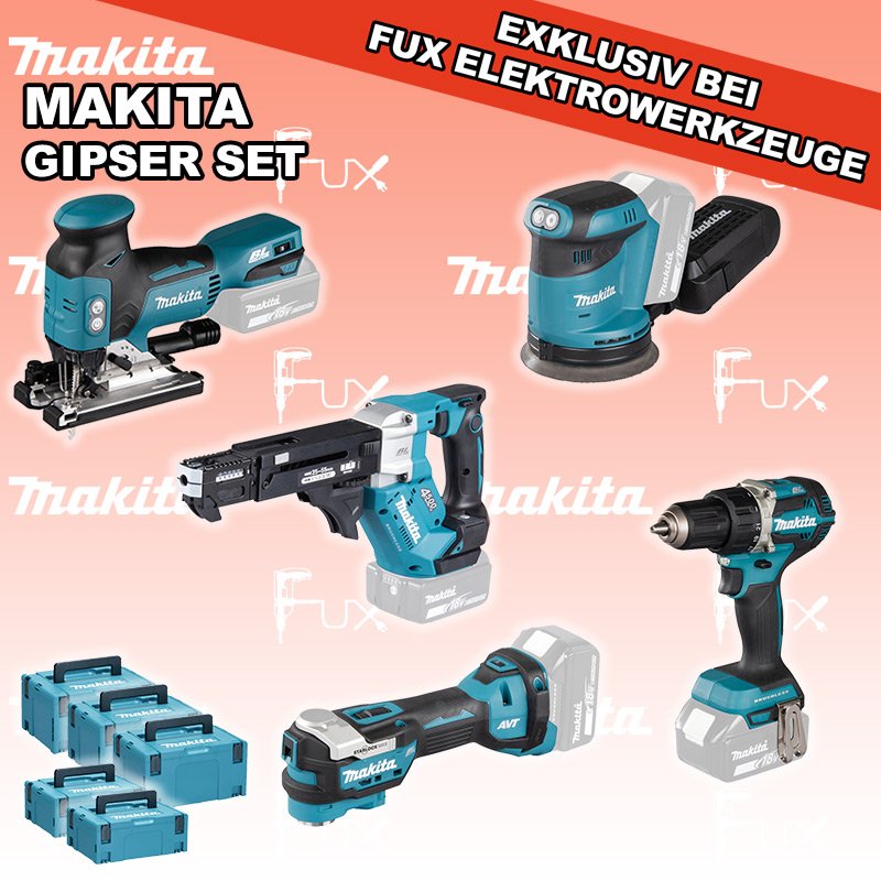 Zu "Gipser Set" von Makita FUX SPECIAL EXKLUSIV BEI FUX Makita Gipser Set 2 SOLO Bestell- und Artikelnummer: maGipser Set 2 SOLO DDF484ZJ Akku-BohrschrauberAkkuspannung 18 V Drehzahlen 0-500 / 0-2000 U/min Drehmoment hart / weich 54 / 30 Nm Gewicht 1.5 kgInfos DFR552Z Akku-MagazinschrauberAkkuspannung 18 V Drehzahl 0 - 4500 min⁻¹ Schnellbauschrauben 25 - 55 mm Gewicht inkl. Akku 1.9 - 2.2 kg kgInfos DBO180ZJ Akku-ExzenterschleiferAkkuspannung 18 V Exzenterhub 2,8 mm Schleifteller (Ø) 125 mm Gewicht 3.6 kgInfos DTM52Z Multifunktions WerkzeugAkkuspannung 18 V Schwingungen 10000 - 20000 min-1 Werkzeugaufnahme Starlock Max System Gewicht inkl. Akku 2.0 kg Infos DJV18ZJ Akku-StichsägeAkkuspannung 18 V Hubzahl 800 - 3500/ min Schnittleistung Holz 135 mm / Stahl 10 mm Gewicht 2.5 kgInfos 2 x MAKPAC Gr. 3Produktabmessung (L x B x H) 377 x 277 x 176 mm Infos Einsatz für DFR551 Einsatz für DFR551 Makpac Koffer Typ C (821551-8)Infos Einsatz für DTM52 Einsatz für DTM52 Makpac Koffer Typ C (821551-8) Infos OHNE AKKUS UND LADEGERÄT Standard-Ausrüstung In diesem Set enthalten: DDF484ZJ Akku-Bohrschrauber DFR552Z Akku-Magazinschrauber DBO180ZJ Akku-Exzenterschleifer DTM52Z Multifunktions Werkzeug DJV18ZJ Akku-Stichsäge 2 x MAKPAC Gr. 3 Einsatz für DFR551 Einsatz für DTM52 Geliefert im Koffer Zubehör Listenpreis CHF 1'507.00 Fuxpreis CHF 1'020.00 inklusive 8.1% MwSt Versand CHF 20.00 Kein Grauimport! Produkt bestellen 1 Stück 2 Stück 3 Stück 4 Stück 5 Stück 6 Stück 7 Stück 8 Stück 9 Stück 10 Stück Option: Makita BL 1860 B ( Li-lon Akku ) für CHF 95.- statt CHF 124.-Infos Alle Angaben ohne Gewähr und solange Vorrat reicht!Wiederverkäufer werden? Produkt als PDF NEUHEITAKTION 32%