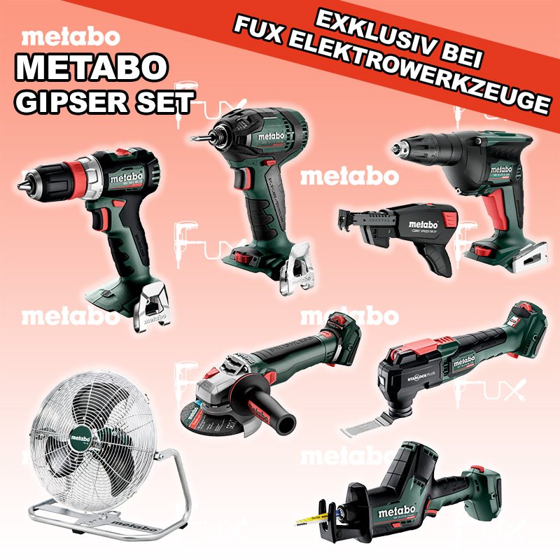 Metabo  Gipser Set 5 SOLO BS 18 L BL Q Akku-Bohrschrauber TBS 18 LTX BL 5000 Akku-Trockenbauschrauber SSD 18 LTX 200 BL Akku-Schlagschrauber WVB 18 LT BL 11-125 Quick Akku-Winkelschleifer SSE 18 LTX BL Compact Akku-Säbelsäge MT 18 LTX BL QSL Akku-Multitool AV 18 Akku-Ventilator Schrauber-Magazin Speed Fix 57