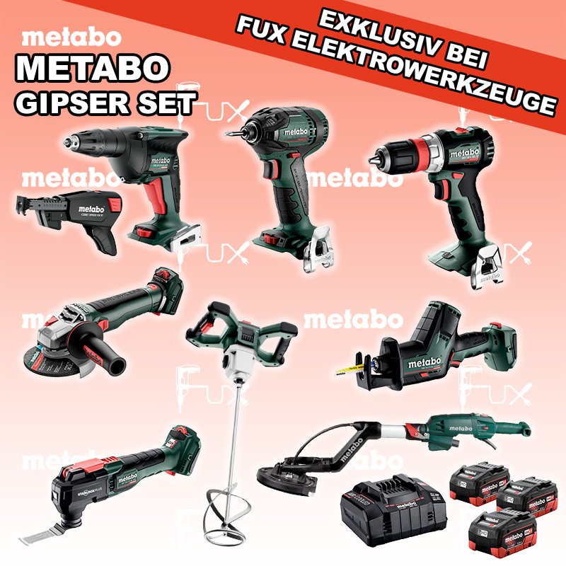 Metabo Gipser Set  9 BS 18 L BL Q Akku-Bohrschrauber TBS 18 LTX BL 5000 Akku-Trockenbauschrauber RW 18 LTX BL 140-2 Akku-Rührwerk SSD 18 LTX 200 BL Akku-Schlagschrauber WVB 18 LT BL 11-125 Quick Akku-Winkelschleifer SSE 18 LTX BL Compact Akku-Säbelsäge MT 18 LTX BL QSL Akku-Multitool LSV 5-225 Comfort Langhalsschleifer 18 V,  5.5 Ah, LiHD Akkupack ASC 145, 12 - 36 V "Air Cooled" Ladegerät Schrauber-Magazin Speed Fix 57
