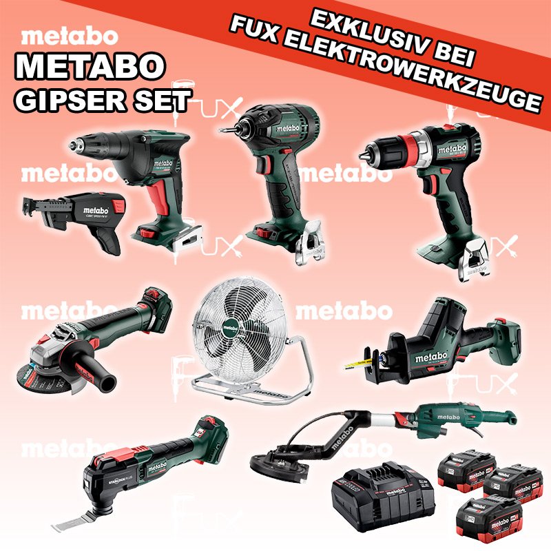 Metabo Gipser Set 11 BS 18 L BL Q Akku-Bohrschrauber TBS 18 LTX BL 5000 Akku-Trockenbauschrauber SSD 18 LTX 200 BL Akku-Schlagschrauber WVB 18 LT BL 11-125 Quick Akku-Winkelschleifer SSE 18 LTX BL Compact Akku-Säbelsäge MT 18 LTX BL QSL Akku-Multitool AV 18 Akku-Ventilator LSV 5-225 Comfort Langhalsschleifer 18 V,  5.5 Ah, LiHD Akkupack ASC 145, 12 - 36 V "Air Cooled" Ladegerät Schrauber-Magazin Speed Fix 57