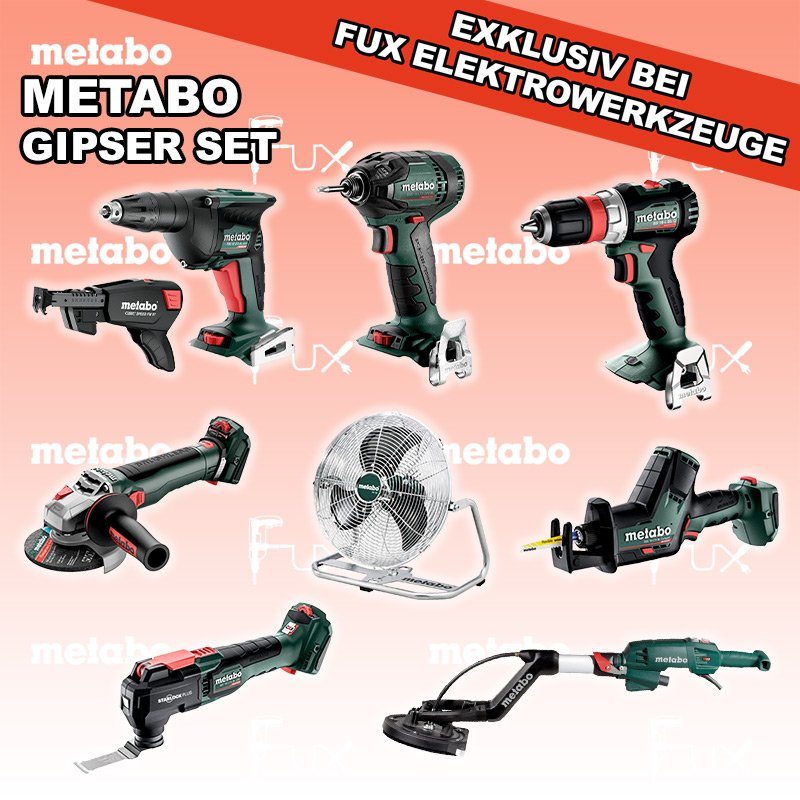 Metabo Gipser Set 11 SOLO BS 18 L BL Q Akku-Bohrschrauber TBS 18 LTX BL 5000 Akku-Trockenbauschrauber SSD 18 LTX 200 BL Akku-Schlagschrauber WVB 18 LT BL 11-125 Quick Akku-Winkelschleifer SSE 18 LTX BL Compact Akku-Säbelsäge MT 18 LTX BL QSL Akku-Multitool AV 18 Akku-Ventilator LSV 5-225 Comfort Langhalsschleifer Schrauber-Magazin Speed Fix 57