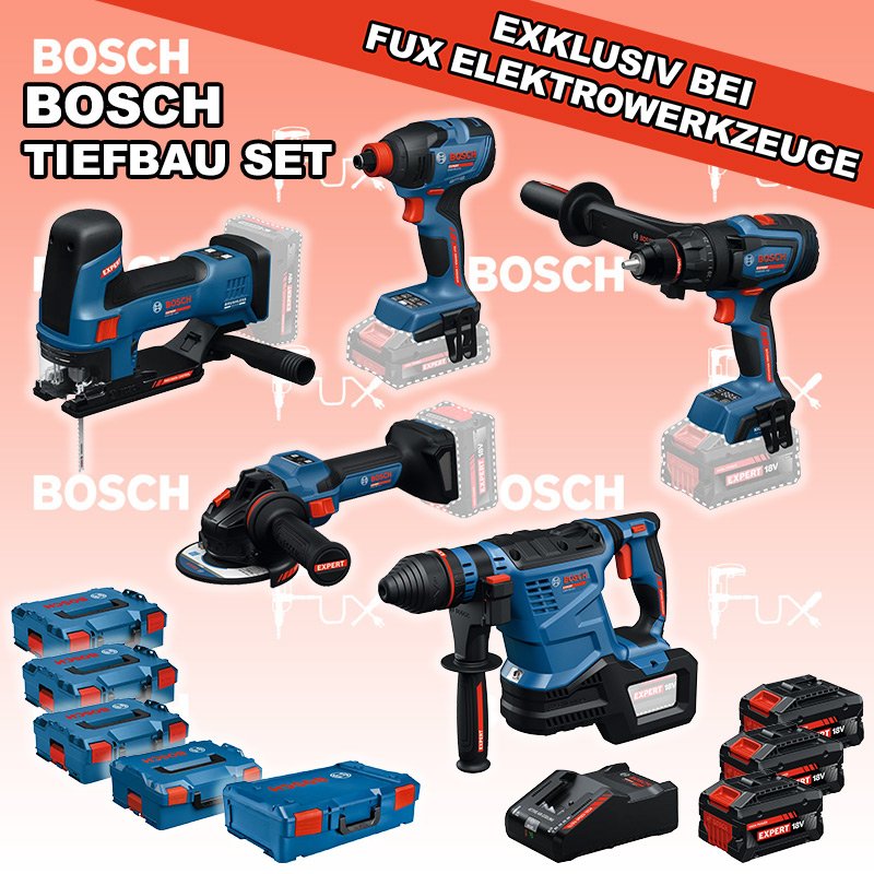 Das Ladenlokal bleibt vom 23. Februar 2026 bis am 28. Februar 2026 geschlossen. Bestellungen und Lieferungen von Neugeräten werden trotz Ferienabwesenheit in gewohnter Fux-Manier entgegengenommen und ausgeliefert. Zu "Bau / Tiefbau Set" von Bosch Professional FUX SPECIAL EXKLUSIV BEI FUX Bosch Expert EXTiefbau Set 1 Bestell- und Artikelnummer: EXTiefbau Set 1 5 Jahre Garantie auf Bosch Expert Maschinen EXSR18V-150 Akku-BohrschrauberAkkuspannung 18 V Drehmoment 84 / 100 / 150 Nm Leerlaufdrehzahl 0 – 550 / 0 – 2200 min⁻¹ Gewicht exkl. Akku 2.1 kgInfos EXBH18V-32F Akku-BohrhammerAkkuspannung 18 V Nenn-Schlagenergie 4.5 J Schlagzahl bei Nenndrehzahl 4300 bpm Nenndrehzahl 0 – 790 min⁻¹ Gewicht exkl. Akku 4.2 kgInfos EXDX18V-210 Akku-DrehschlagschrauberAkkuspannung 18 V Drehmoment. max. 210 Nm Leerlaufdrehzahl 0 - 1100 / 0 - 1700 / 0 - 2300 min⁻¹ Schlagzahl 0 - 4000 bpm Gewicht exkl. Akku 1.2 kgInfos EXST18V-155S Akku-StichsägeAkkuspannung 18 V Hubzahl bei Leerlauf 800 - 3800 min⁻¹ Hubhöhe 26 mm Gewicht exkl. Akku 1.9 kgInfos EXWS18V-15S Akku-WinkelschleiferAkkuspannung 18 V Leerlaufdrehzahl 11000 min⁻¹ Scheiben-Ø 125 mm Gewicht exkl. Akku 2.2 kgInfos 3x EXBA18V-80 + EXAL18V-160 Starter-Set3 x EXBA18V-80 Akkupack EXAL18V-160 LadegerätInfos Standard-Ausrüstung In diesem Set enthalten: EXSR18V-150 Akku-Bohrschrauber EXBH18V-32F Akku-Bohrhammer EXDX18V-210 Akku-Drehschlagschrauber EXST18V-155S Akku-Stichsäge EXWS18V-15S Akku-Winkelschleifer 3x EXBA18V-80 + EXAL18V-160 Starter-Set Geliefert im Koffer Zubehör Listenpreis CHF 2'673.90 Fuxpreis CHF 2'084.00 inklusive 8.1% MwSt Kostenloser Versand Kein Grauimport! Produkt bestellen 1 Stück 2 Stück 3 Stück 4 Stück 5 Stück 6 Stück 7 Stück 8 Stück 9 Stück 10 Stück Alle Angaben ohne Gewähr und solange Vorrat reicht! Produkt als PDF NEUHEITAKTION 22%