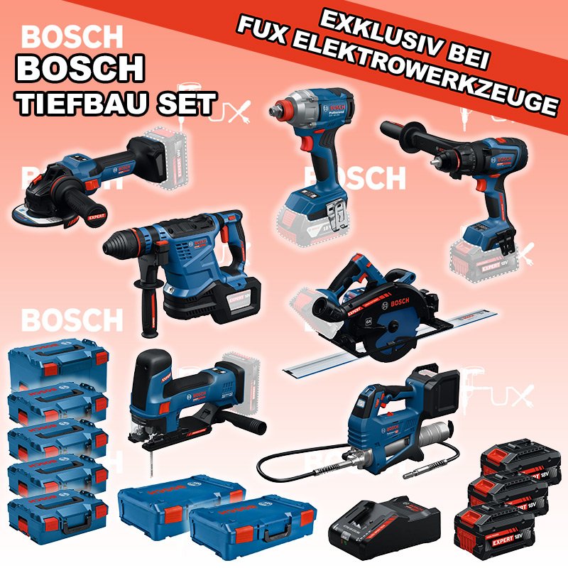 Bosch Expert EXTiefbau Set  3 EXSR18V-150 Akku-Bohrschrauber EXBH18V-32F Akku-Bohrhammer EXST18V-155S Akku-Stichsäge EXWS18V-15S Akku-Winkelschleifer GDX 18V-285 Akku-Drehschlagschrauber GFP 18V-10 Akku-Kartuschenpresse EXKS18V-68GX Akku-Kreissäge FSN 1600 Führungsschienensysteme Systemzubehör 3x EXBA18V-80 + EXAL18V-160 Starter-Set